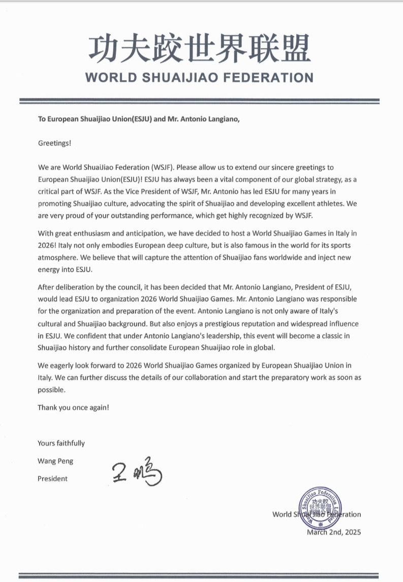 We eagerly look forward to 2026 World Shuaijiao Games organized by European Shuaijiao Union in Italy. We can further discuss the details of our collaboration and start the preparatory work as soon as possible.
